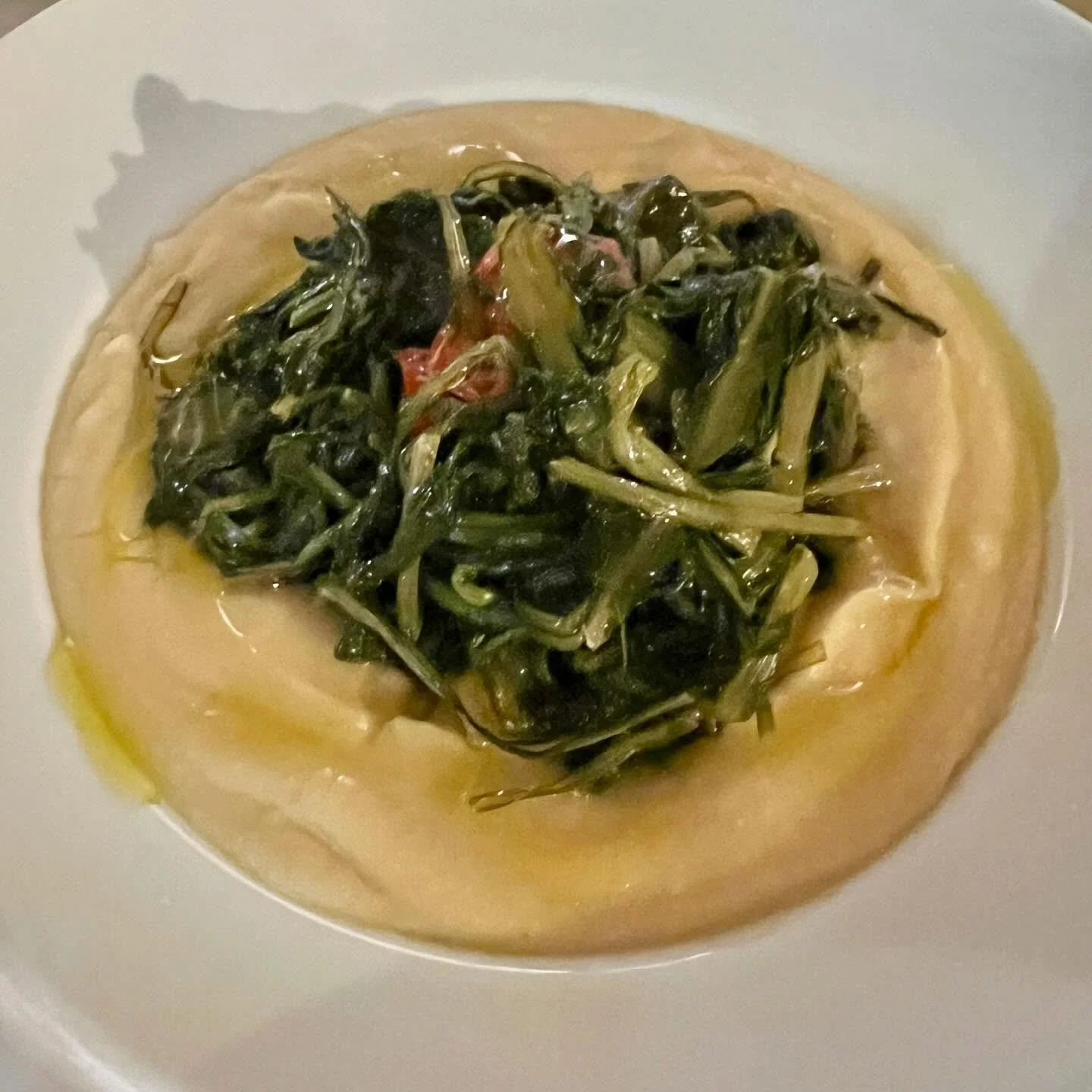 𝗙𝗮𝘃𝗲 𝗲 𝗖𝗶𝗰𝗼𝗿𝗶𝗮 is a traditional Puglian dish made from creamy fava bean purée topped with sautéed wild chicory. The mild, buttery flavor of the beans contrasts with the slightly bitter greens. It’s the combination of these two unpretentious ingredients that sort of epitomize southern Italian cooking, here you can taste influences from North Africa, Egypt, the Middle East and Greece. Historically, Puglia, especially the port town of Brindisi, was a key port for trade between these places. I have seen Fave e Cicoria on every menu in town and expect to see it as I go further into Puglia. This is the kind of dish you’ll want to douse in local olive oil and smear around with bread. The way olive oil couples with bean purées is something regal even if it is dirt cheap.